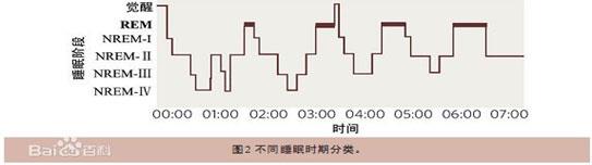 NREM期均從1期開始,1期為1~7分鐘,占總總睡眠的2~5%,這個時期易驚醒;2期持續(xù)10~25分鐘,每個循環(huán)逐漸延長,占總睡眠的45~55%,驚醒需要很大的刺激;3、4期兩期睡眠常合稱為慢波睡眠(sws)δ睡眠或者深睡眠,慢波活動占據(jù)50%以上,需要更大的刺激才能導致覺醒。